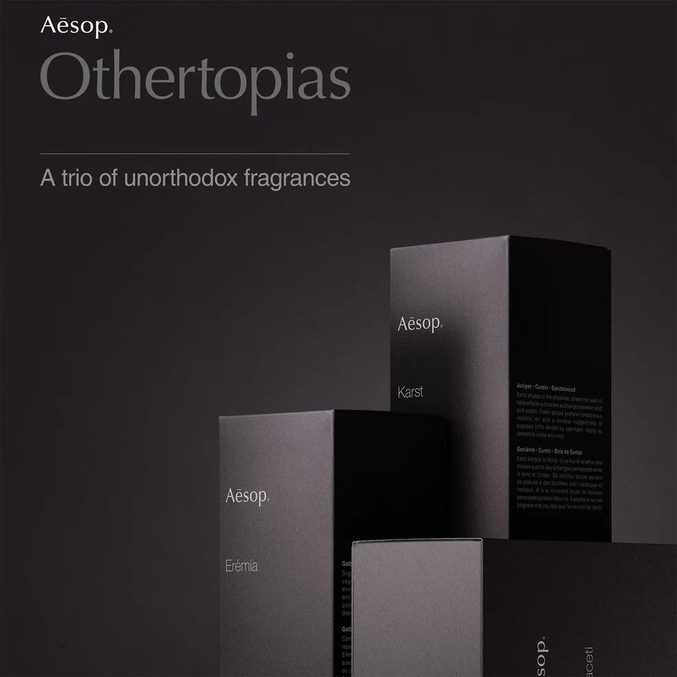 From the brand's Othertopias collection, this fragrance whisks you away to an otherworldly realm amongst the waves, brimming with aromatic, verdant and citrus accords. Starring a mélange of tart juniper, bergamot and rich pink pepper, this fragrant elixir then deepens into a spiced flavour profile of rosemary, sage and cumin which are then balanced by soft notes of vetiver, sandalwood and cedarwood. Why not layer it with the brand's complementary hand and body care formulations to enhance this mysterious aroma?