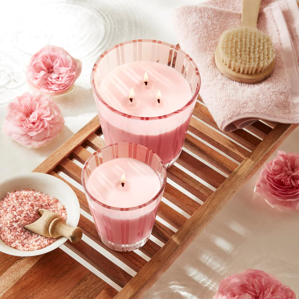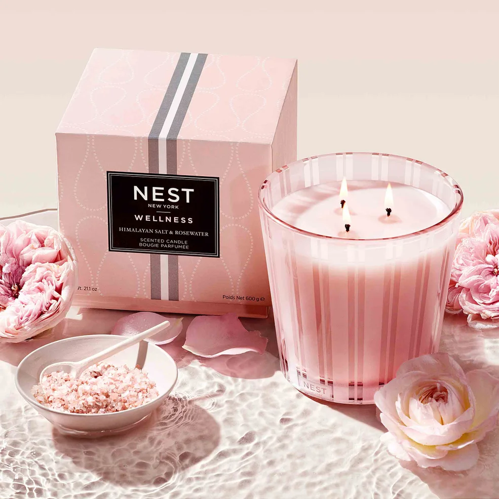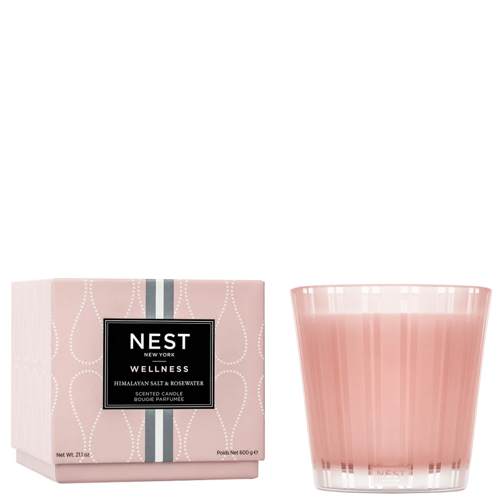 With pink-tinted wax (cleverly formulated for an even burn) housed in a matching, etched glass jar, the Himalayan Salt and Rosewater 3-Wick Candle is your secret for scenting your sanctuary, with an impressive burn time of up to 100 gorgeous-smelling hours.