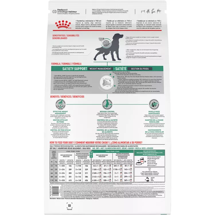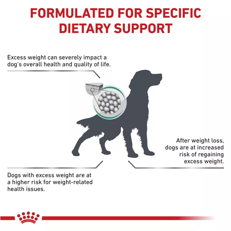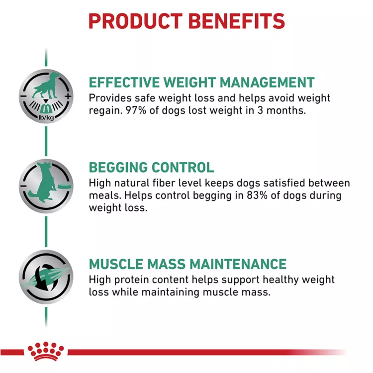 Royal Canin Satiety Support Weight Management Dry Dog Food is part of a comprehensive line of veterinary-exclusive formulas for overweight and obese dogs. This veterinary-exclusive adult dog food is specially formulated to promote safe weight loss in overweight and obese dogs. In fact, in a clinical trial, 97% of dogs lost weight in three months, and begging was controlled in 83% of dogs. This weight control diet promotes satiety, meaning it provides a feeling of satisfaction, which helps your dog feel full between meals and be less likely to beg. Its high fiber content helps reduce a dog's tendency to want to eat spontaneously throughout the day, and glucosamine and chondroitin support joint and bone health. Balanced essential nutrients ensure nutrient requirements are met, while high protein helps maintain muscle mass. Soluble and insoluble fibers promote healthy digestion and optimal stool quality. Plus, antioxidants support a healthy immune system. Remember, exercise like regular walks and playtime can also help your lovable dog achieve a healthy weight. Be sure to consult your veterinarian to know what level of activity is appropriate for your pet.