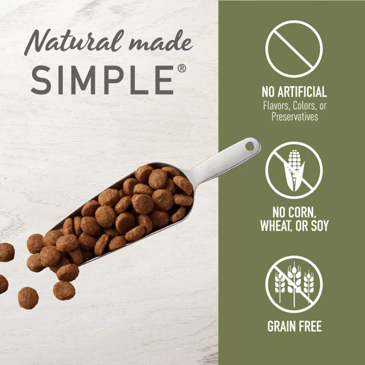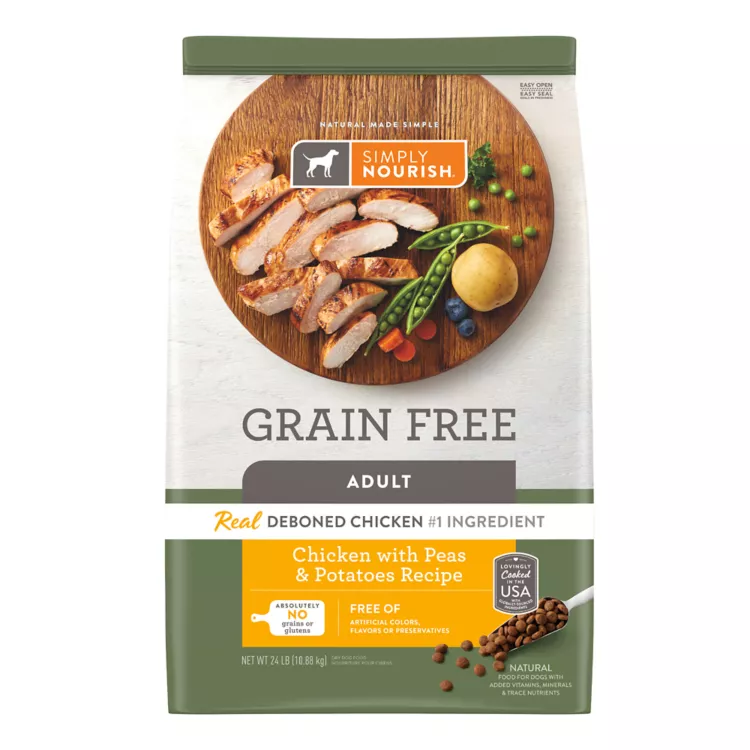 Simply Nourish Chicken with Peas & Potatoes Recipe Grain Free Adult Dog Food includes a blend of superfoods like kale, pumpkin, blueberries and other naturally nutritious ingredients, each chosen for their role in supporting skin & coat, digestion and overall health. Feed your dog's well-being with this delicious dry blend.