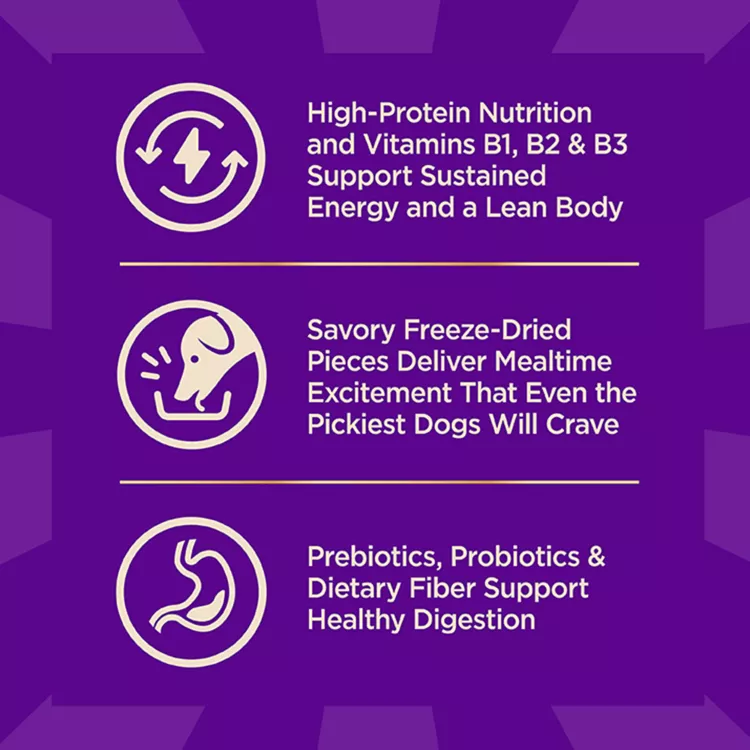 GRAIN–FREE ADULT DRY DOG FOOD: Protein packed, nutrient dense kibble combined with 100% raw freeze–dried lamb pieces for a crave worthy savory dog food; with optimal protein levels, high fiber and calorie content your dog needs to thrive.